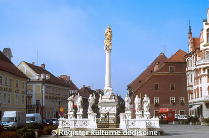 Znamenje z Marijinim kipom na stebru in kipi svetnikov stoji na dvignjenem podstavku za ograjo sredi trga. Na mestu baročnega originala dela Jožefa Strauba iz leta 1748 stoji kopija. |